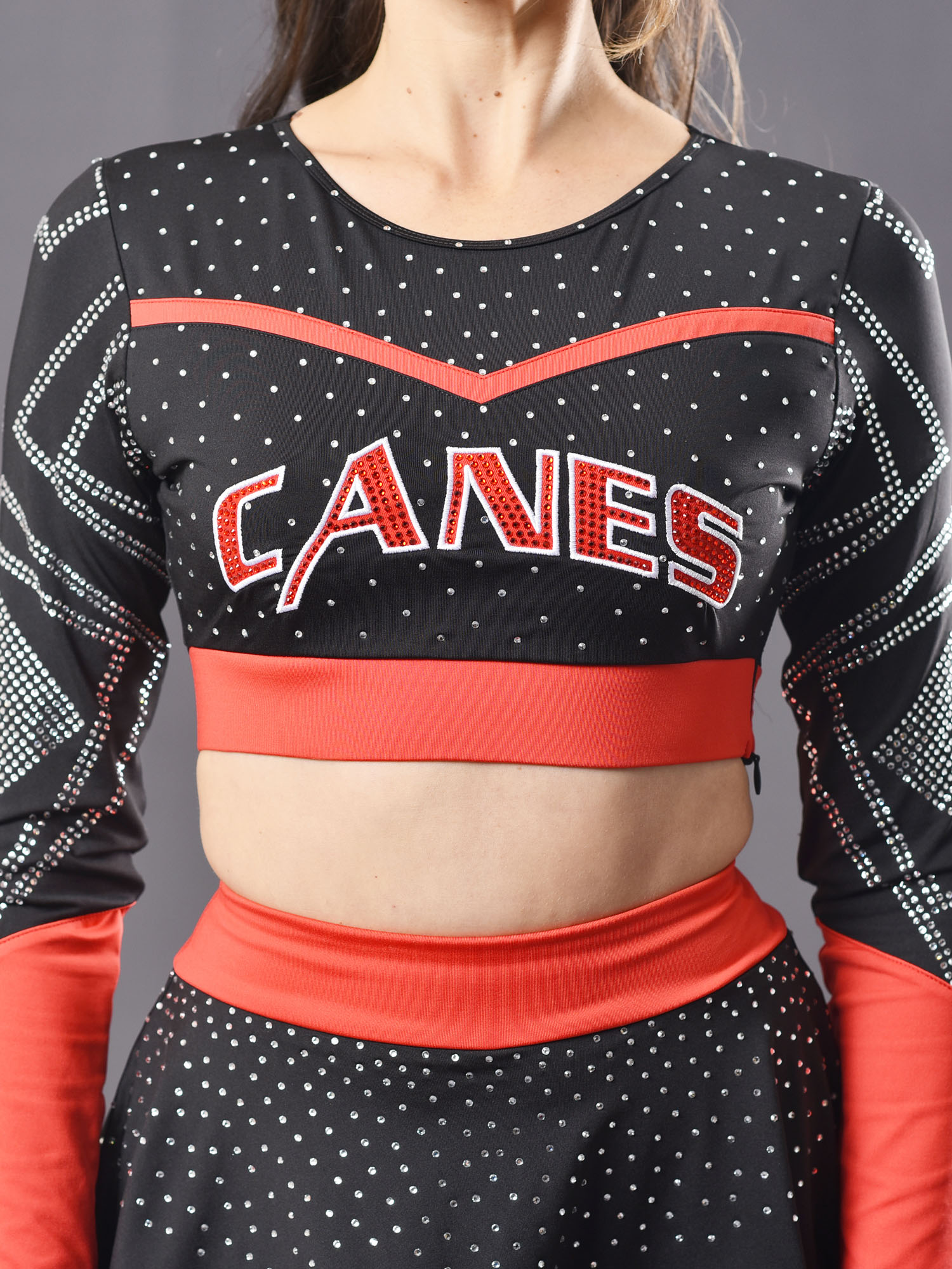This all star cheer uniform is perfect for competition with a unique rhinestone detail on sleeves, tons of rhinestones!