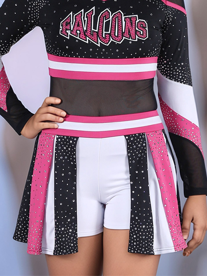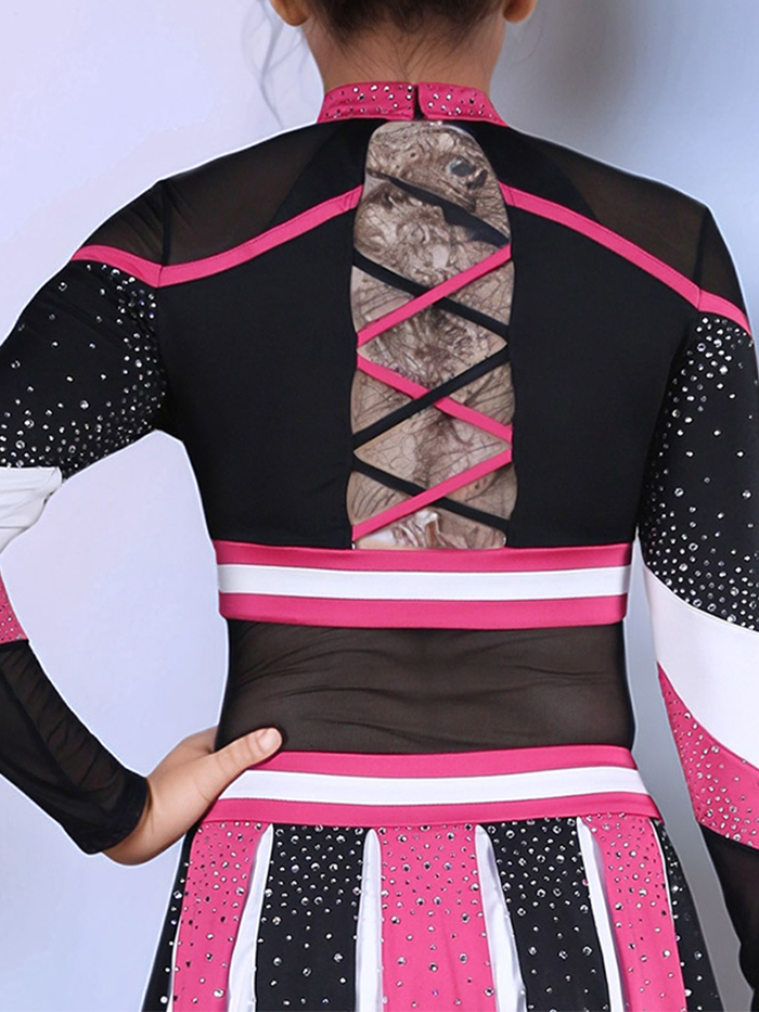 This uniform features a strappy back with buttons for closure, tons of rhinestones, and mesh inserts !