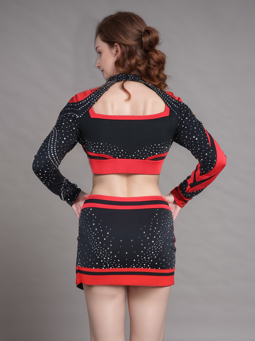 This uniform features a high neck with open back, keyhole sleeves, tons of rhinestones!