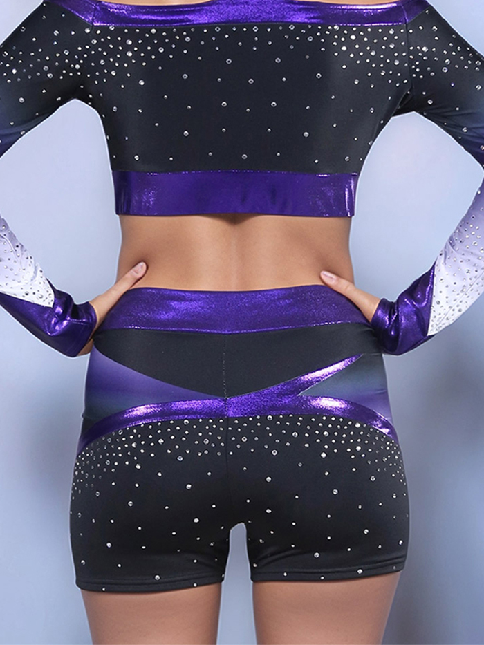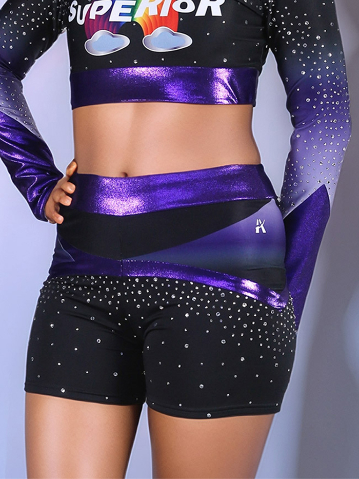 Bottom type shown: Fitted shorts with real rhinestones and metallic inserts