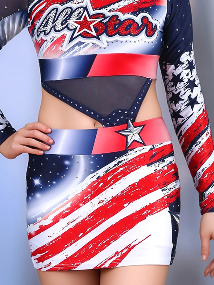 Bottom type shown: A-line skirt features a wrap-style design with a continuation of the flag-inspired pattern and a 3D silver star belt buckle at the waist for a show-stopping centerpiece.