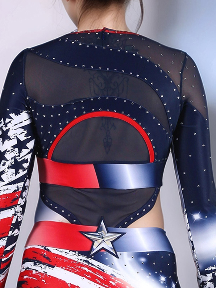 Top type shown: Long-sleeve with a mesh panel cutout at the midsection; accented with sparkling rhinestones across the chest and sleeves.