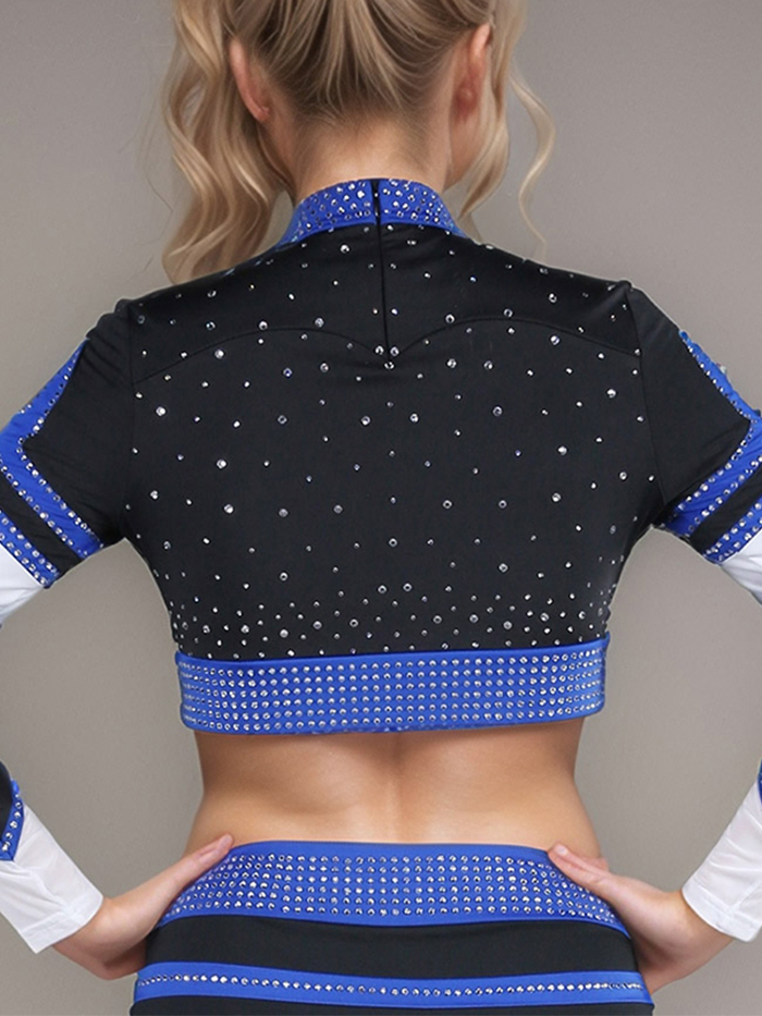 Top type shown: Long sleeve midriff top with rhinestone high neck, zipper on back for closure, available as a crop or full length. On the other hand, you can buy our mesh bodysuit separately.