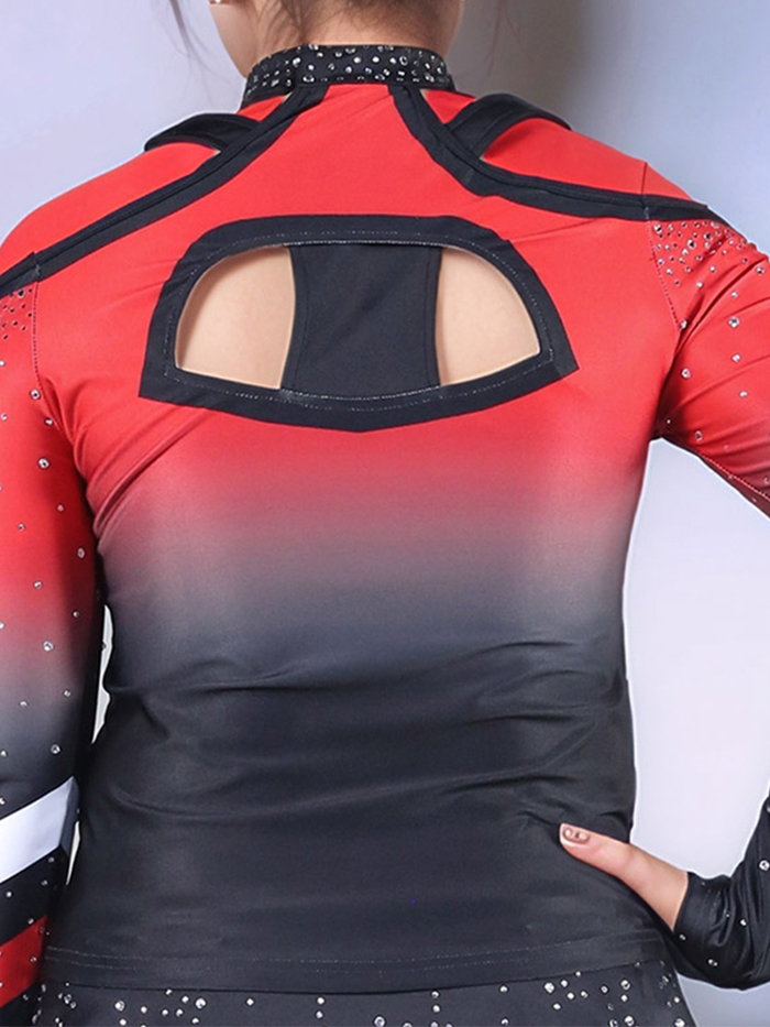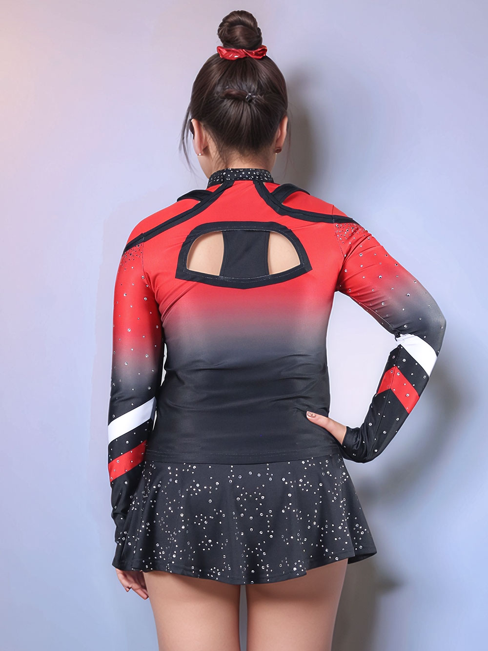 Top type shown: Long sleeve top with a gradient red-to-black ombré effect, crystal embellishments, and striking white and red arm accents, available as a crop or full length. On the other hand, you can buy our mesh bodysuit separately.