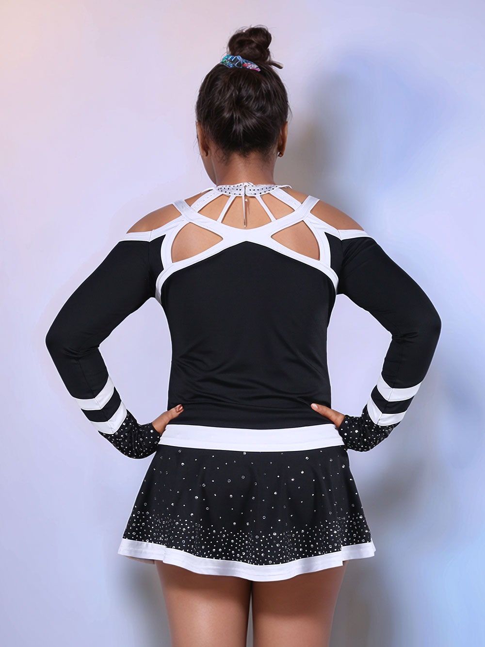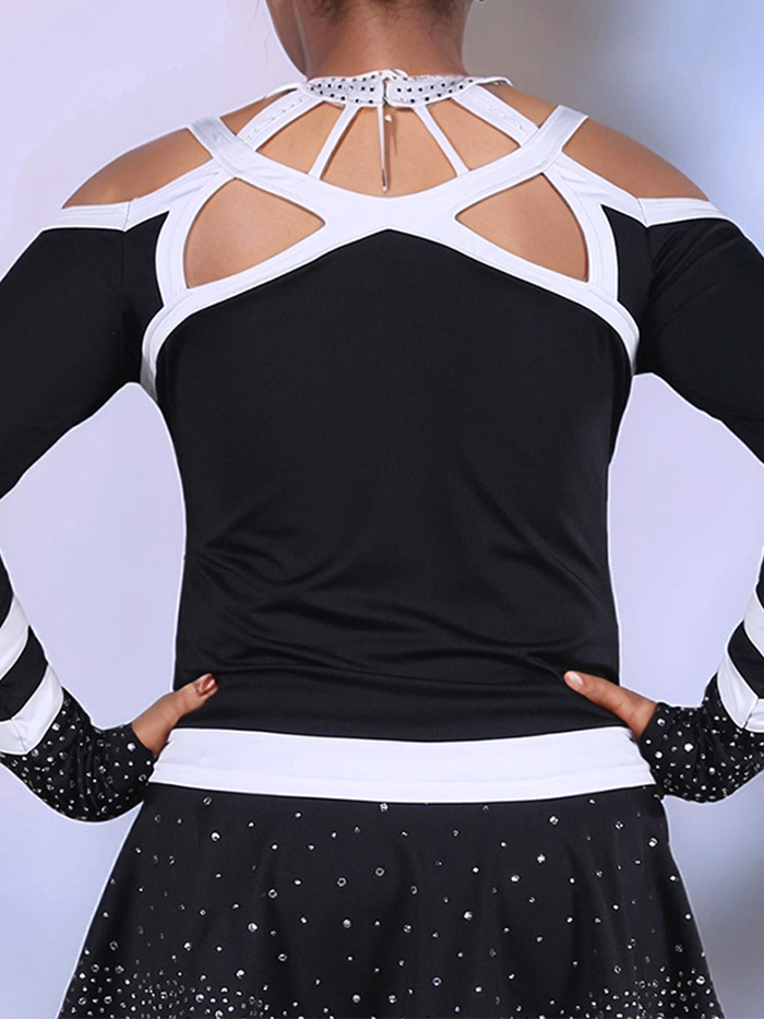 Top type shown: Long sleeve top with a striking cold-shoulder top with a high neckline embellished in rhinestones and an intricate strappy cutout back, available as a crop or full length. On the other hand, you can buy our mesh bodysuit separately.