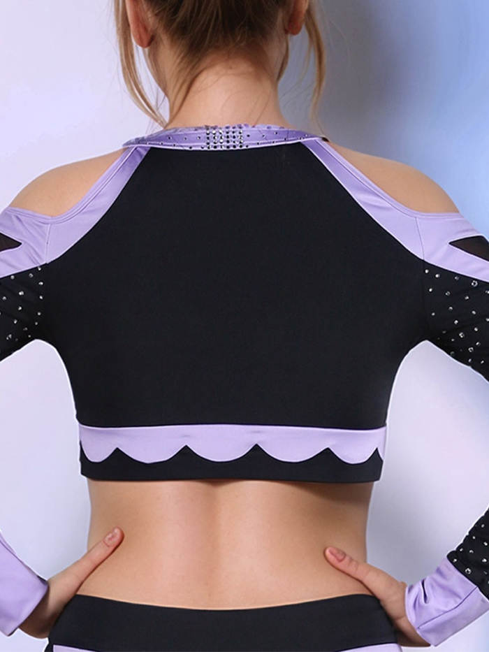 Top type shown: a cold-shoulder crop top with sparkling rhinestone detailing and scalloped lavender edging, available as a crop or full length. On the other hand, you can buy our mesh bodysuit separately.