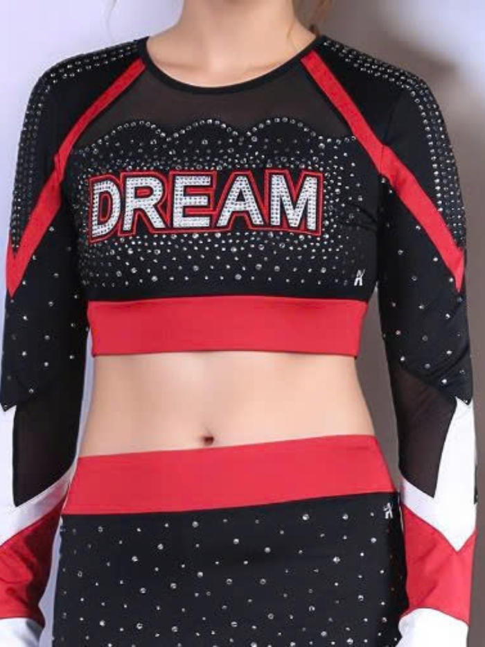 The sleek crop top features bold red accents, sheer mesh panels, and sparkling rhinestone scatter across the front and sleeves. The word “DREAM” takes center stage in eye-catching rhinestones, inspiring confidence and passion on and off the mat.