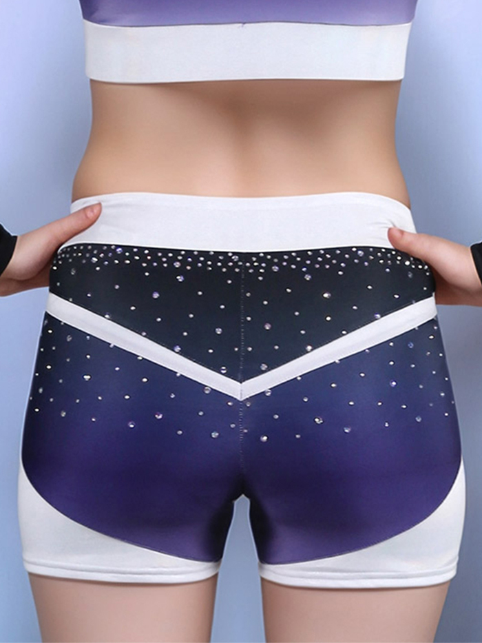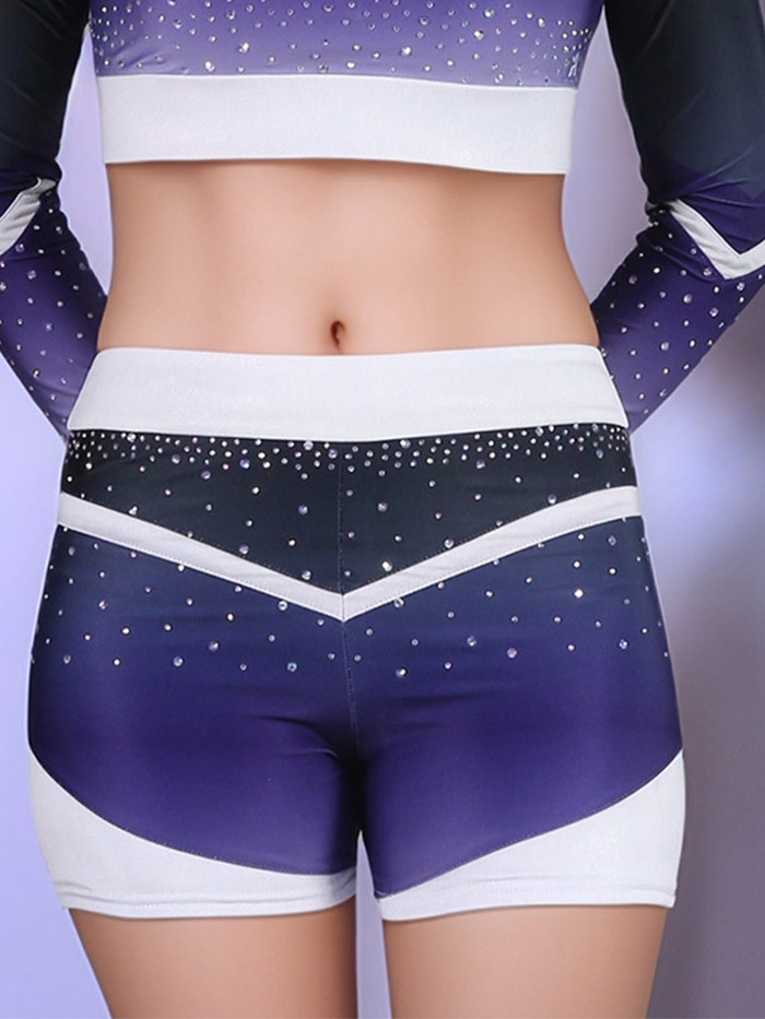 The matching high-waisted cheer shorts are both flattering and functional, with a chevron-cut design, ombré fade, and rhinestone accents to match the top. Built with stretch-performance fabric, this set ensures flexibility, breathability, and confidence in every routine.
