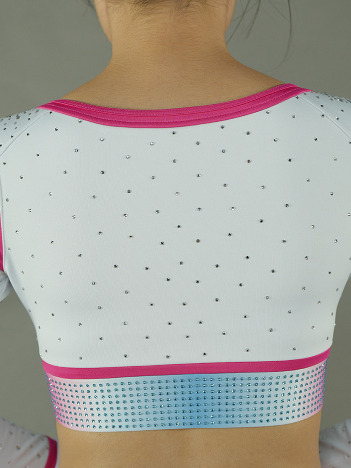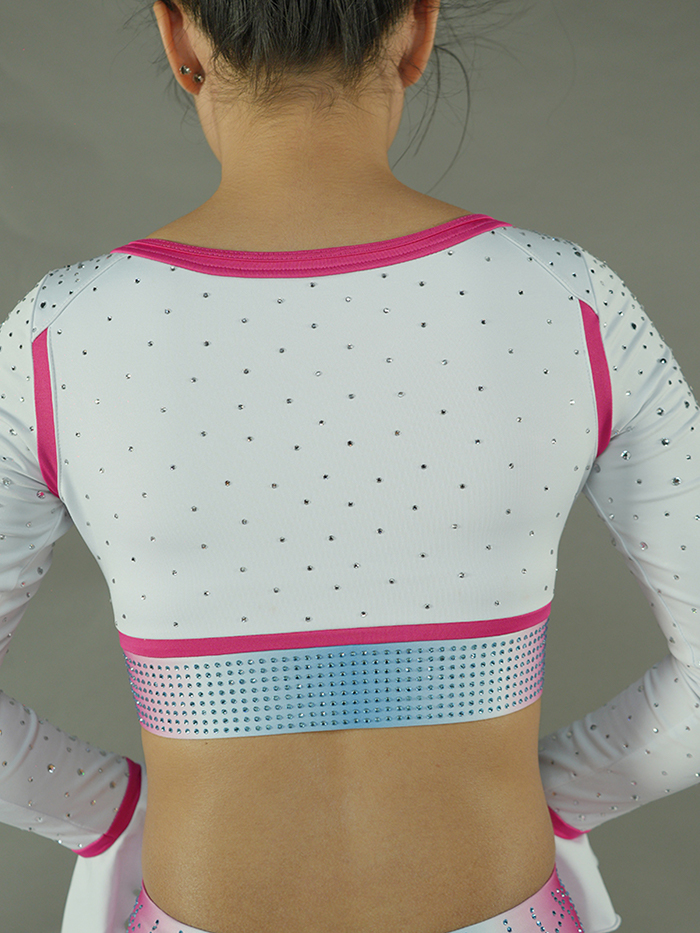 • Top: Long-sleeve white crop top with a soft pink neckline and sky-blue waistband gradient. The “HEALY” logo is outlined in brilliant rhinestones across the chest, while the body and sleeves are covered in scattered stones for elegant all-over sparkle. Flared cuffs add a stylish touch.