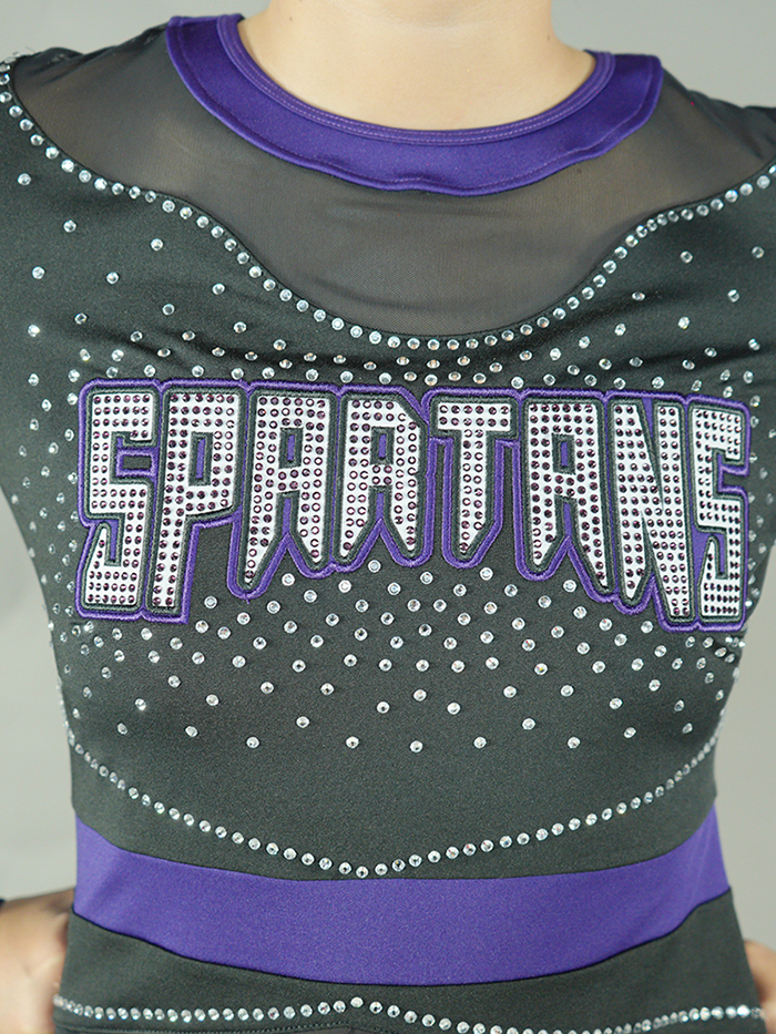 Top: Black and purple crop top with sheer mesh shoulders, chest, and full sleeves. The “SPARTANS” team name is prominently displayed in bold varsity lettering with full rhinestone framing. Scattered stones create a shimmer effect across the front and sleeves. Unique curved seam lines are outlined with rhinestones for added precision and polish.