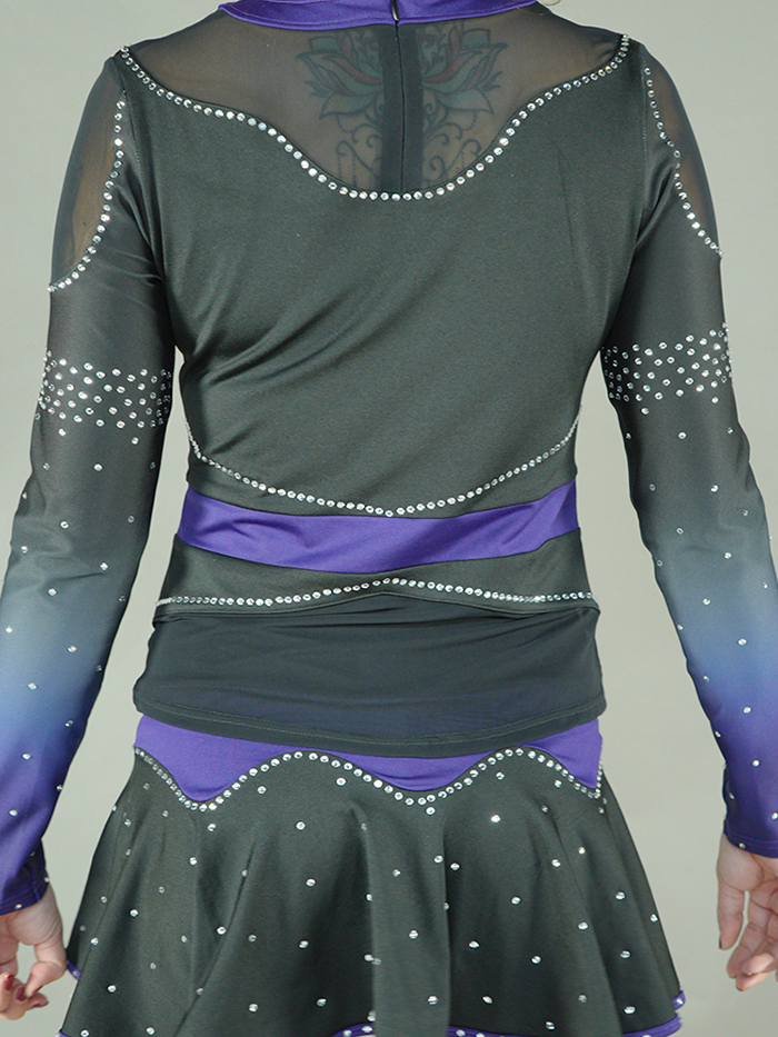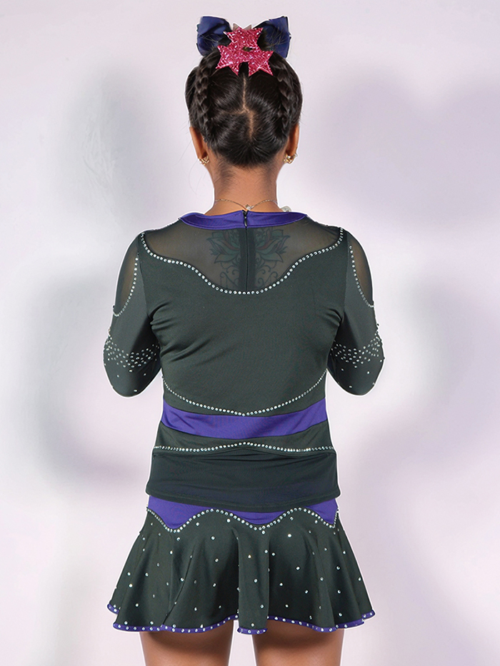 Skirt: Coordinated black skirt with purple waistband and scalloped hem. Allover rhinestone embellishment ensures your team sparkles in motion. Built-in shorts allow for confident performance.