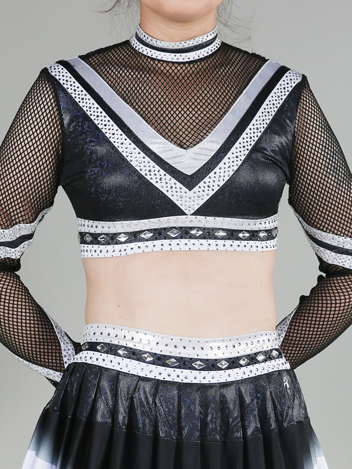 Top: Long-sleeve black crop top with fishnet mesh sleeves and upper chest, structured V-neckline trim in shimmering silver, and premium rhinestone bands across the chest and collar. A mock-neck closure and bold pattern give this look serious performance power.