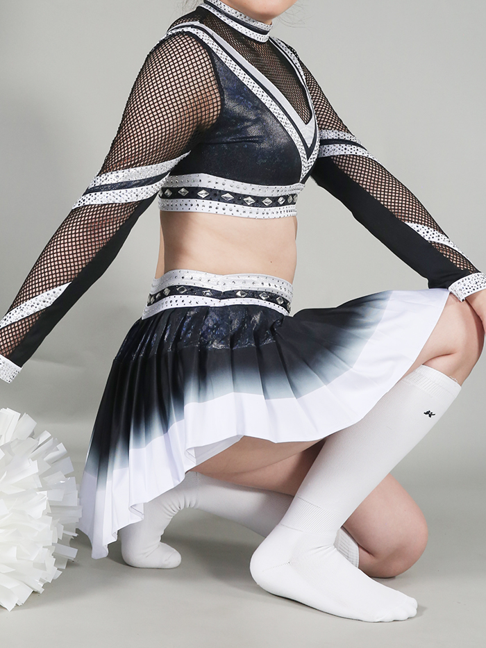 Skirt: Coordinated asymmetrical layered cheer skirt with a black-to-white vertical ombré fade. Faux leather texture and a rhinestone-encrusted waistband elevate the style, while pleated construction adds flow and movement to each performance.