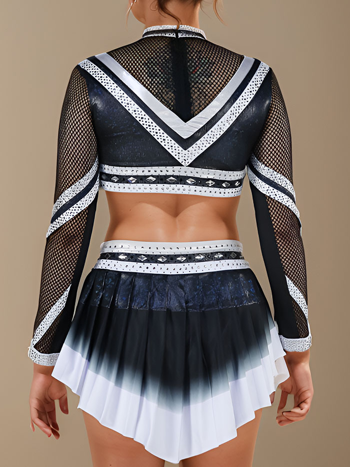 Modern, fierce, and fashion-forward — the NAS083 Allstar Cheer Uniform turns heads with its high-contrast palette, layered textures, and dramatic lines. Featuring full mesh coverage, ombré fade, and stunning rhinestone accents, this design blends performance readiness with runway-inspired detail.