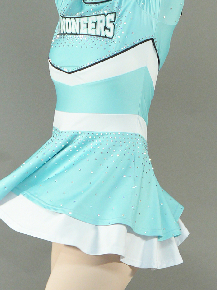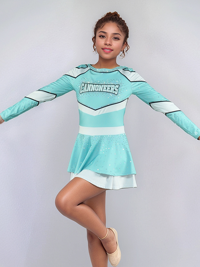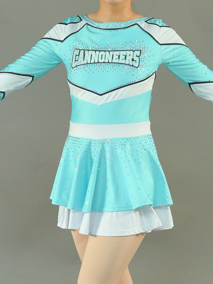 The AD007 “CANNONEERS” Performance Dress blends grace and strength into one unforgettable look. Made in a refreshing aqua blue with sleek white and black accents, this long-sleeve dress features a layered skirt and elegant cutout back details for added style and mobility. Scattered rhinestones sparkle across the bodice, sleeves, and skirt, while the bold team name adds a strong visual punch to this fluid, competition-ready design.