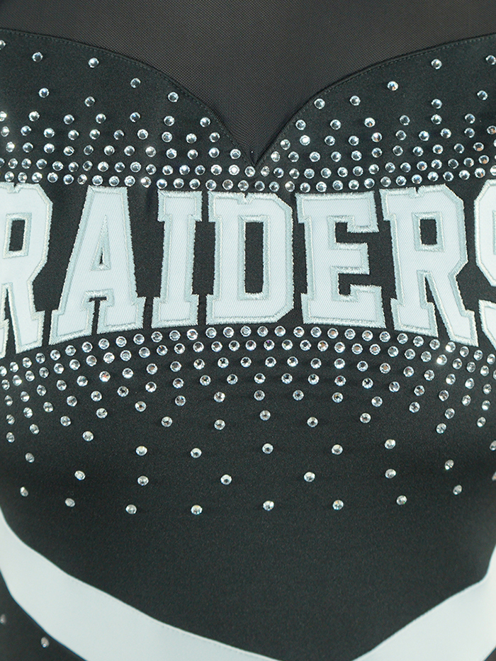 Keep it sporty, sleek, and sparkling in the Allstar Performance Dance Dress AD015. This energetic black and white design features short sleeves for maximum movement and a bold white diagonal stripe that cuts across the waist for a dynamic silhouette. The upper bodice includes a black mesh insert for added edge, while the entire dress is dotted with rhinestones that intensify around the hemline for extra shine. The “RAIDERS” team name is boldly displayed in a block-letter style, making this dress perfect for teams who bring both style and strength to the stage.