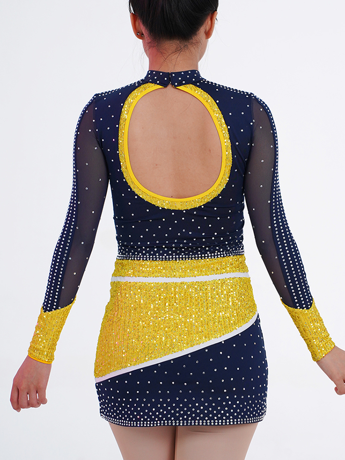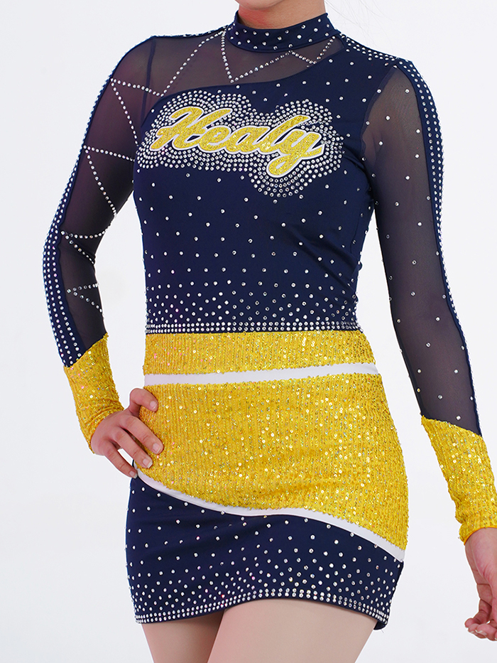This stunning all-star performance dress combines elegance and energy in a sleek, professional silhouette. The deep navy base is beautifully contrasted with vibrant gold sequin accents and rhinestone embellishments that shimmer under the lights. The “Healy” logo across the chest adds a touch of team pride, while sheer mesh sleeves provide breathability and a graceful edge. The open-back cutout framed with gold sequins delivers a bold, modern finish. Designed from high-quality stretch fabric, this dress ensures flexibility, comfort, and a flawless fit for both dance and cheer competitions.