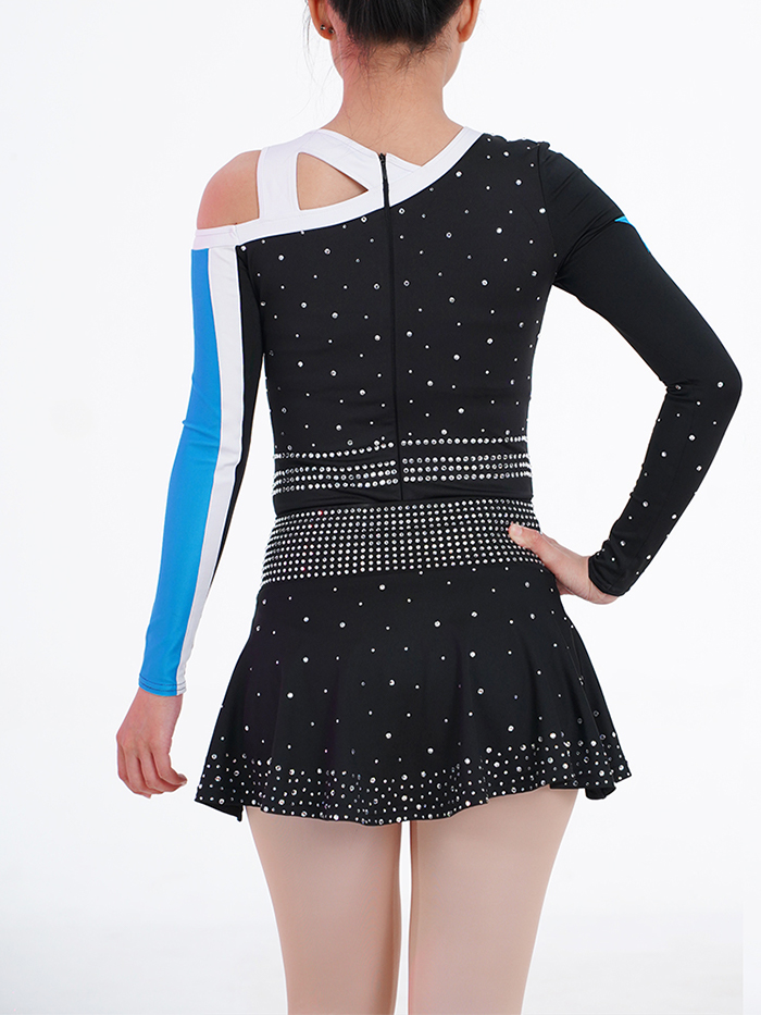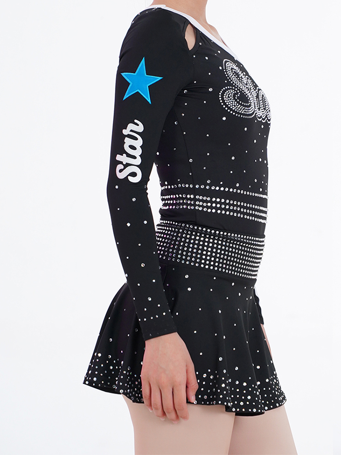 This chic all-star performance uniform blends athletic edge with glamorous shine. The sleek black base is adorned with rhinestone embellishments, creating a brilliant sparkle under stage lights. The “Star” logo across the chest shines in crystal accents, while the asymmetrical neckline and color-block sleeves add a contemporary flair. The detachable skirt, decorated with matching rhinestones, allows versatility between practice and performance looks. Made from premium stretch fabric, this set provides comfort, flexibility, and durability for high-energy routines.