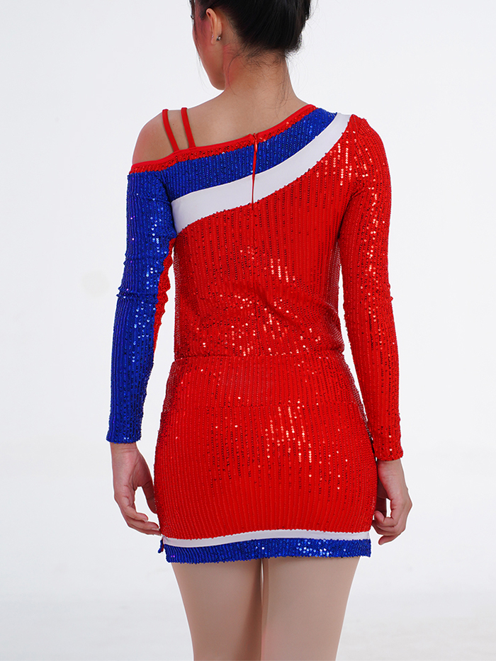 This vibrant all-star performance uniform combines bold color contrast and modern style. The one-shoulder design brings an edgy, asymmetrical look, featuring a radiant red base with blue and white accents for a classic cheer appeal. Covered in high-shine sequins, it captures the spotlight effortlessly, while the “PATRIOTS” logo across the chest makes a strong team statement. The matching sequin skirt completes the look with full movement and sparkle. Crafted from stretchable, breathable fabric, this set ensures all-day comfort and stage-ready flexibility for both cheer and dance competitions.