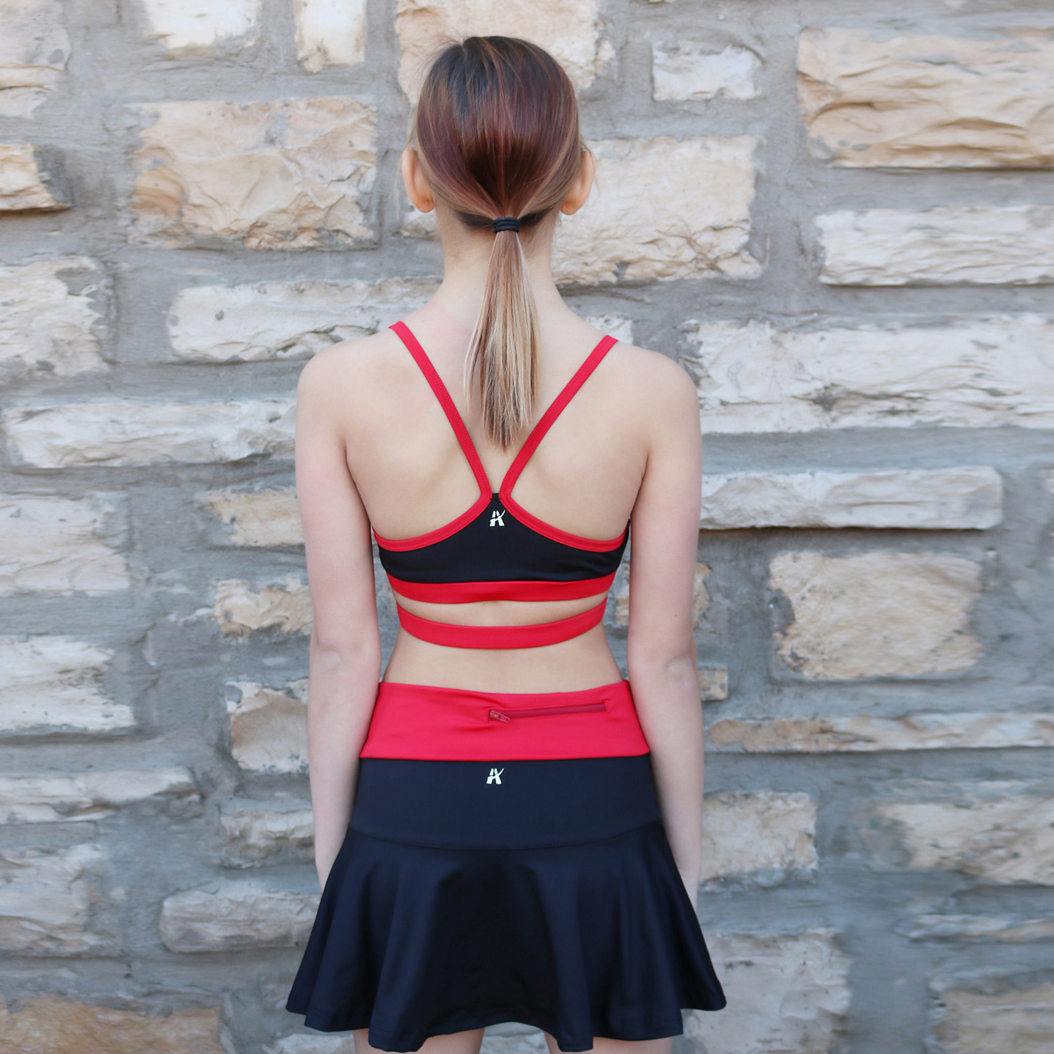 This set includes a strappy bra + high waisted skirt