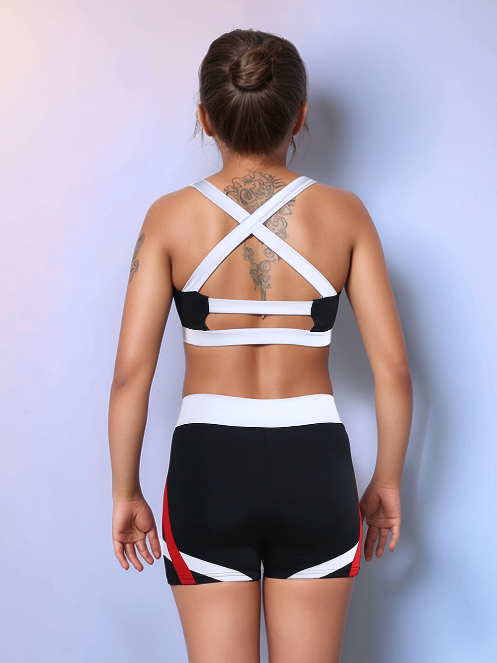 This set includes one Sports Bras with strappy back+ overlap waist shorts.