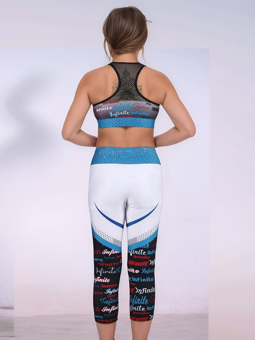This set includes a sports bra with racer back + high waisted capri with bling band