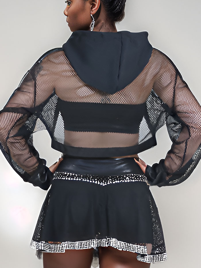 Add a layer of glam to your practice look with the CPW111 Black Glitter Mesh Skirt, designed to sparkle and swirl with every move. This layered mesh overlay features a glittery black waistband, a shimmering rhinestone-accented V-front panel, and a flouncy black net hole body that brings playful energy to any practice or performance look.
