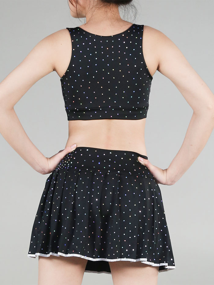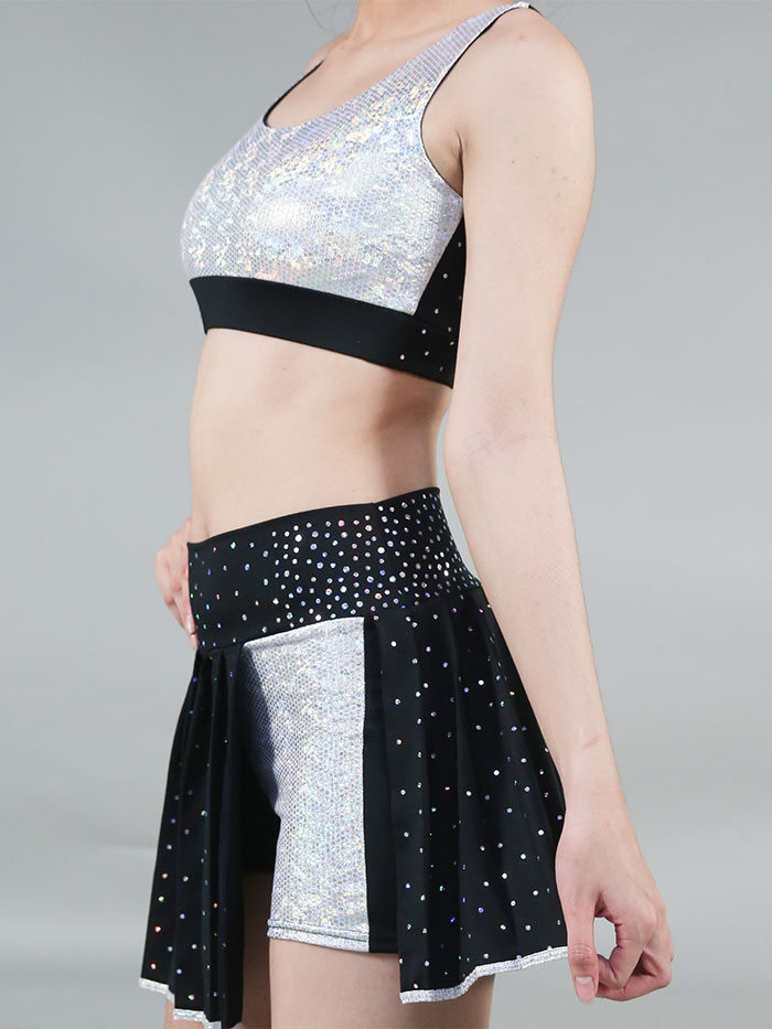 Turn every move into a moment with the CPW114 Cheer Skirted Shorts, combining the flair of a skirt with the wow factor of holographic performance shorts underneath. This black cheer skirt features a shimmering spangle scatter across the waistband and hem, while a bold side slit reveals a flash of silver holo shine for the perfect pop of performance drama.