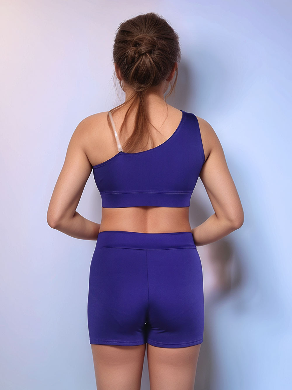 This set includes a one shoulder sports bra  + overlap waisted shorts.