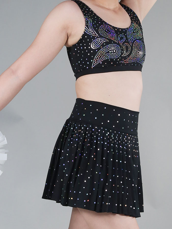 Bottom: The matching pleated skirt features an ultra-stretch waistband, scattered spangles, and sharp pleats for elegant movement. The perfect mix of fun, flair, and flexibility.