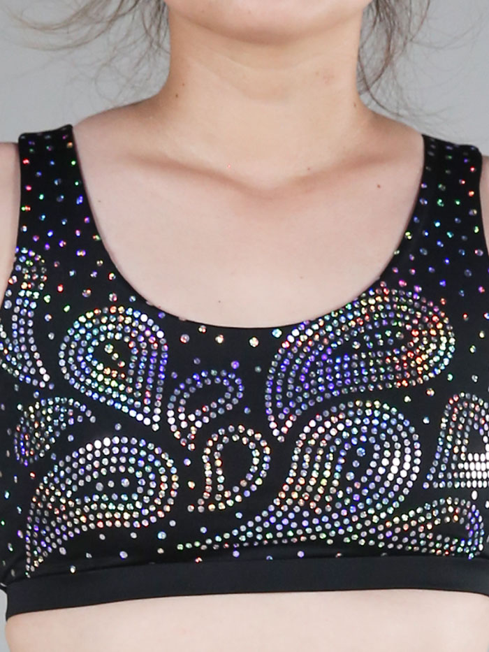 Top: The dazzling sports bra features a high-impact spangle swirl pattern across the front and is built with a snug, supportive fit for performance and practice. Designed for maximum sparkle and comfort.