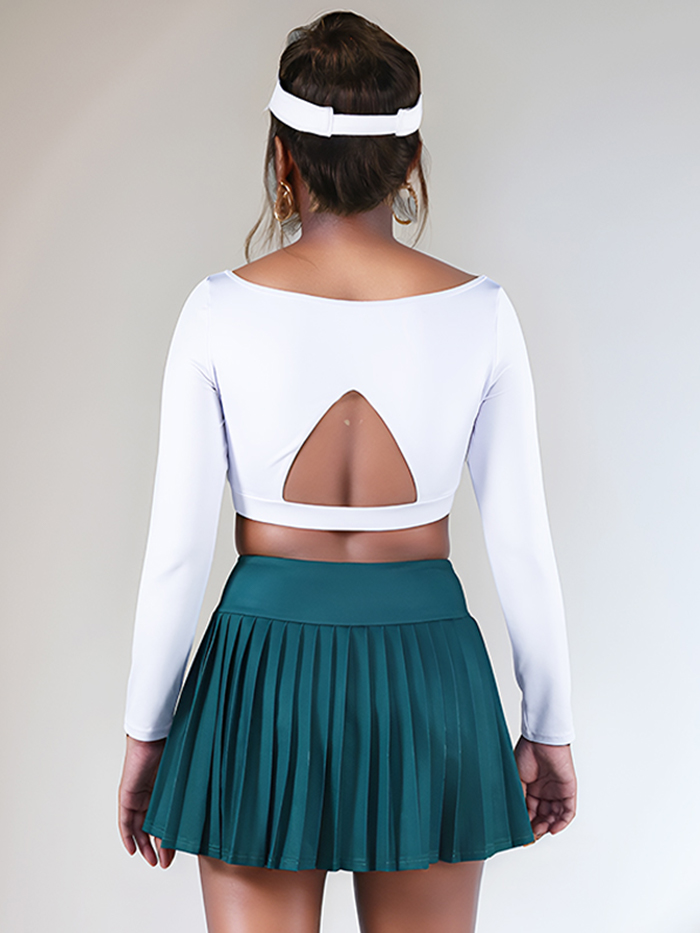 Description: Stay sleek and performance-ready with the CPW161 cheer practice wear set – a stylish combination of a fitted long sleeve crop top and a pleated high-waisted skirt. The crop top features an elegant open-back diamond cut-out for breathability and flair, while the skirt delivers full mobility and a flattering silhouette with its classic pleats. Ideal for school dance, team practices, or casual performances, this set offers comfort, movement, and modern style all in one.