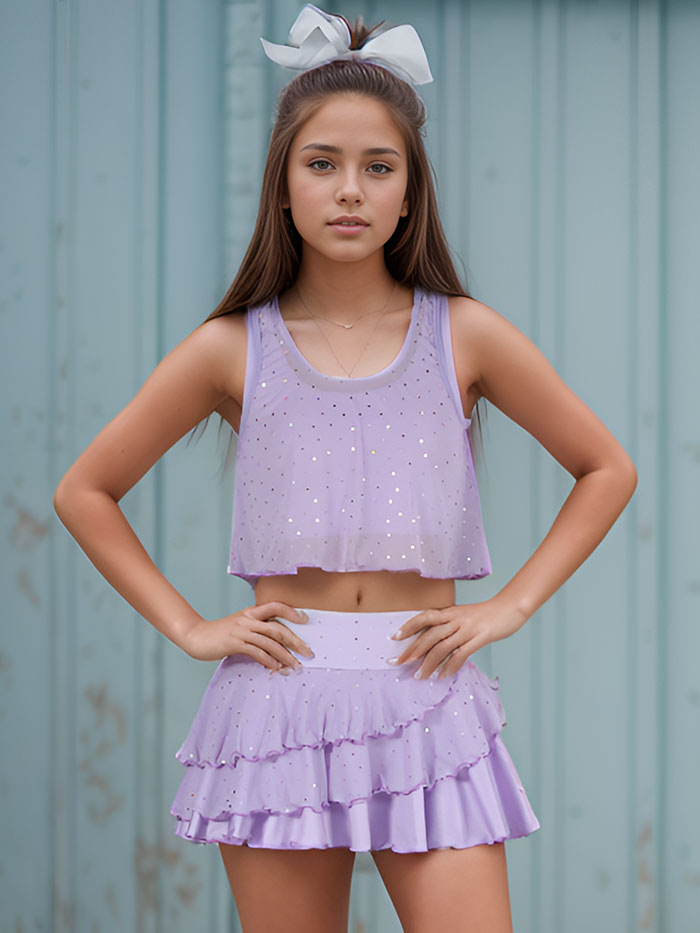 Bring flair to your next practice session with this dazzling CPW169 set. Featuring a shimmer-studded crop sport bra with a clean back design for comfort and mobility, this outfit is paired with a high-waisted asymmetrical ruffle skirt. The skirt layers glimmer with every movement and are accented with subtle spangles for a radiant finish.