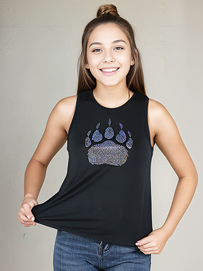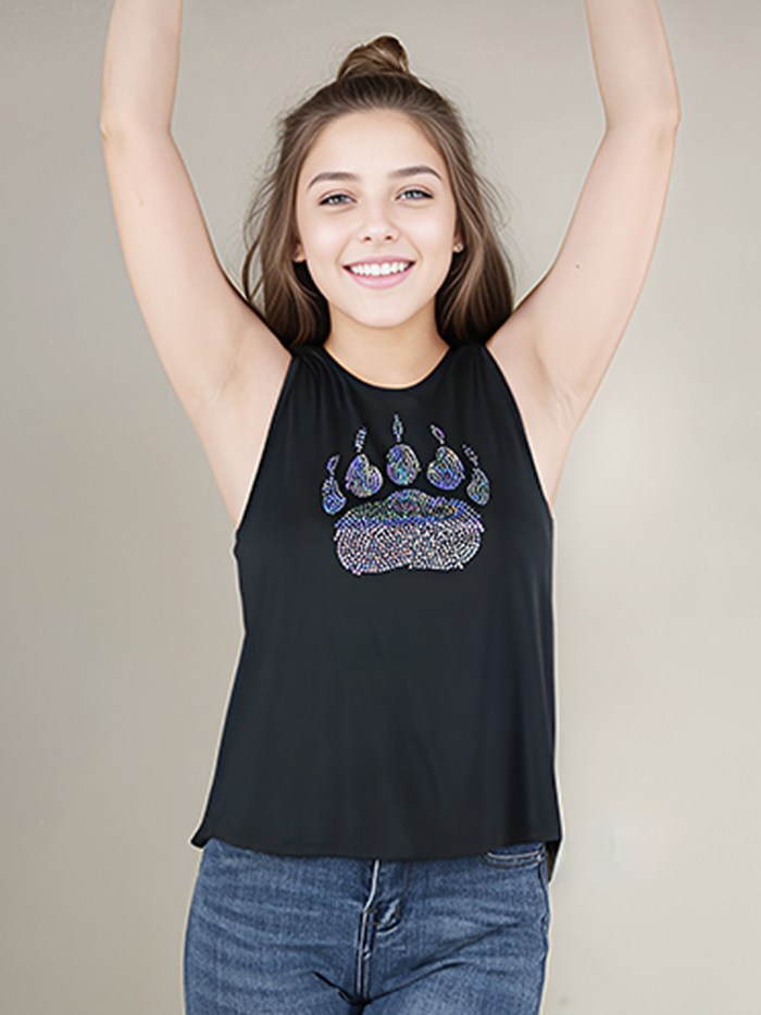 This seamless racerback tank is light weight, breathable, and perfect for wearing on-the-go. The front features a bold bear paw made entirely of shimmering spangles that glisten with movement. Designed in a soft black stretch fabric, this racer-style tank offers a stylish twist with a tulip-back opening, giving it a breathable, relaxed fit while still looking sharp. Mix and match with other styles to complete the look.