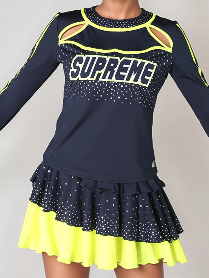 Top: Sleek navy long-sleeve design with neon yellow shoulder cutouts and trim accents. The bold “SUPREME” team name is front and center, surrounded by scattered spangles across the chest and sleeves for added dazzle.