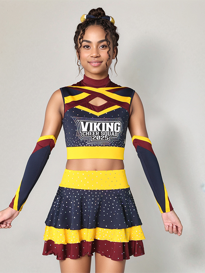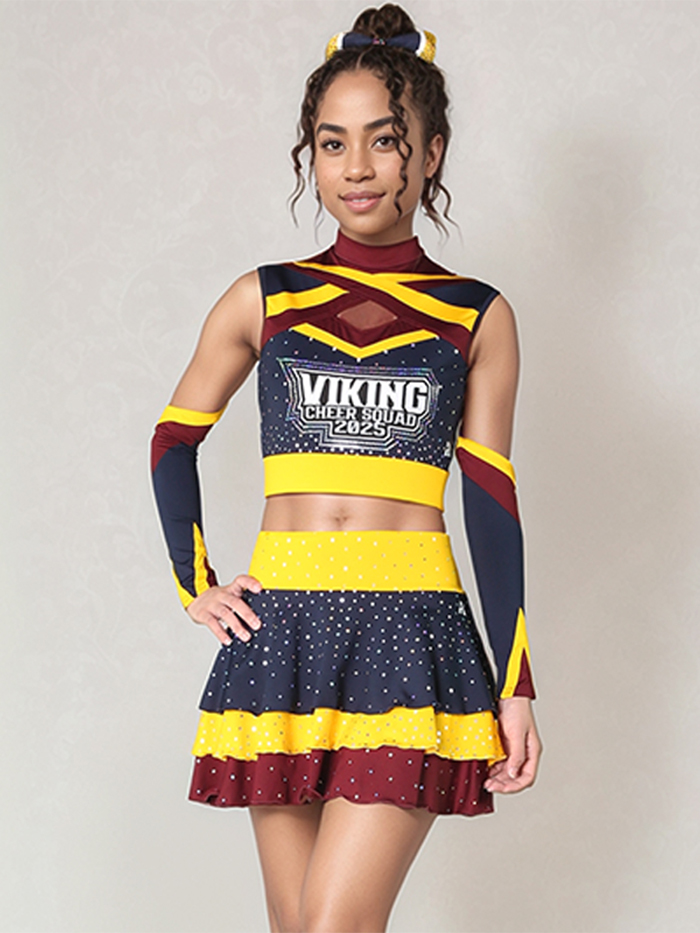 • Top: Sleeveless crop top with a striking maroon and gold crisscross neckline, geometric chest cutout, and “VIKING CHEER SQUAD 2025” printed front and center. Decorated with lightweight spangles that shimmer with every motion.