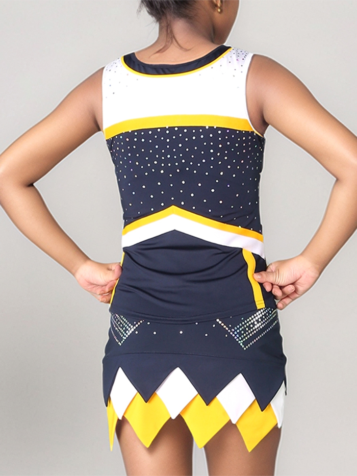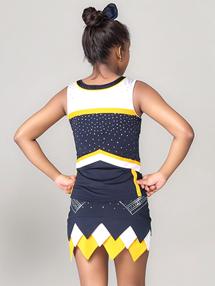 • Skirt: Unique jagged-edge skirt with built-in shorts, chevron side accents, and dazzling spangle embellishments throughout the waistband and hem. Layers of white, yellow, and navy create strong visual motion.