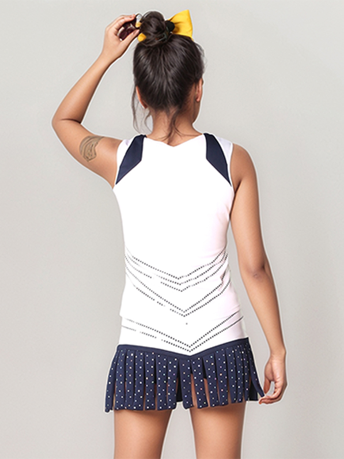 Skirt: One-of-a-kind split-pleat navy skirt with a white chevron waistband and spangle embellishments throughout. Each pleat sparkles with lightweight spangles for a modern, high-energy effect.