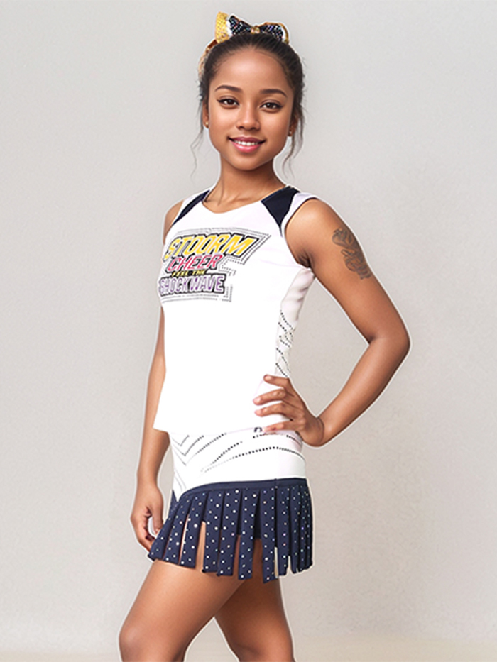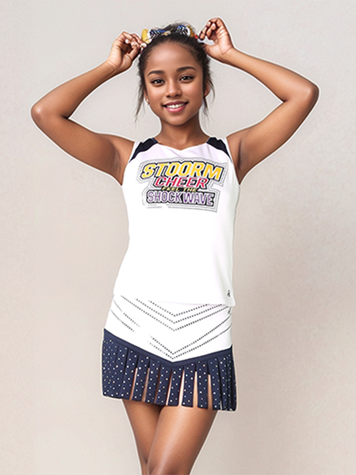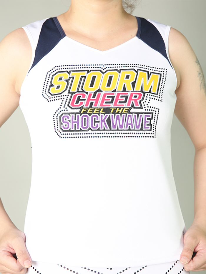Top: Sleeveless white V-neck design with sharp black shoulder accents. “STORM CHEER SHOCKWAVE” is boldly printed on the chest, surrounded by subtle spangles that catch the light with every move.