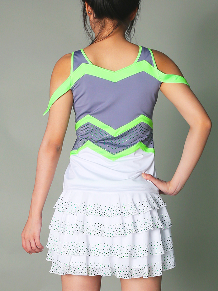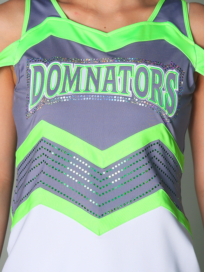 Top: Grey and white body with high-contrast neon green accents and chevron striping across the chest and waist. “DOMINATORS” is boldly printed across the chest, surrounded by shimmering spangles that add eye-catching sparkle. Cold shoulder cutouts give this top a trendy, athletic edge.