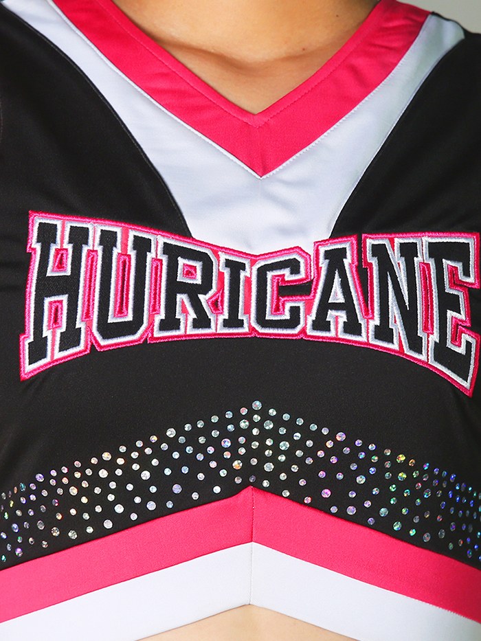 Top: Black sleeveless crop top with V-neck accent trim in white and hot pink. “HURRICANE” lettering is boldly printed across the chest, enhanced with shimmering spangles across the midsection for maximum sparkle. Features a flattering keyhole cutout at the waist for an edgy, modern twist.