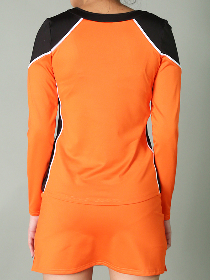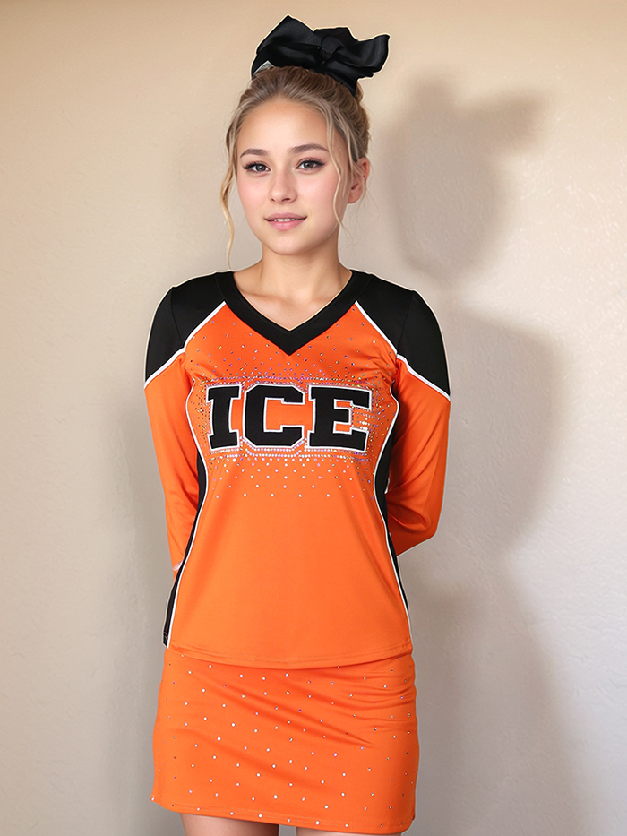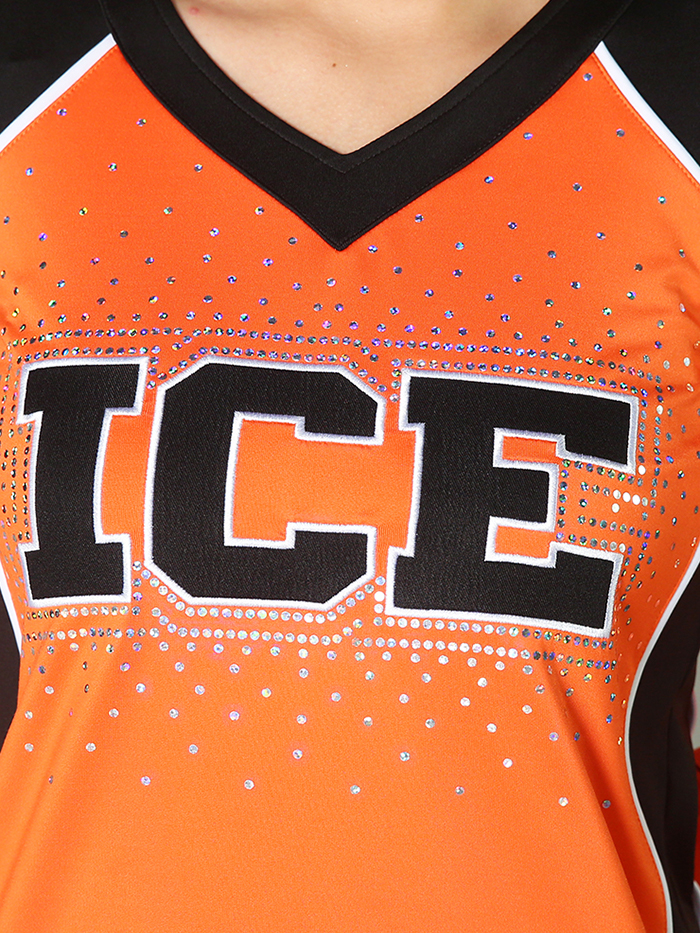 Top: Long-sleeve pullover top in vibrant orange with bold black-and-white piping accents. The “ICE” team name is front and center in varsity block lettering, surrounded by scattered spangles that shimmer under stadium lights.