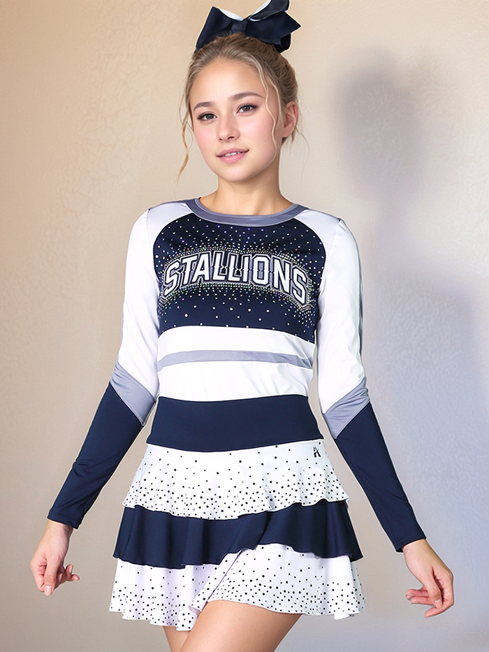 Top: Long-sleeve round-neck top in navy and white color blocking, featuring silver accent stripes and a bold “STALLIONS” varsity name on the chest. Scattered spangles radiate around the logo to draw attention and add sparkle under lights.