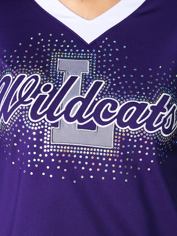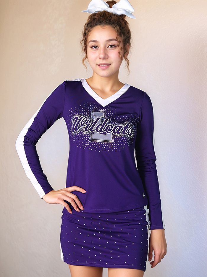 Top: Long-sleeve V-neck top in rich purple with contrasting white trim and sleeve accents. “Wildcats” script lettering overlays a bold varsity block letter, surrounded by radiant spangles that add shine and school spirit.