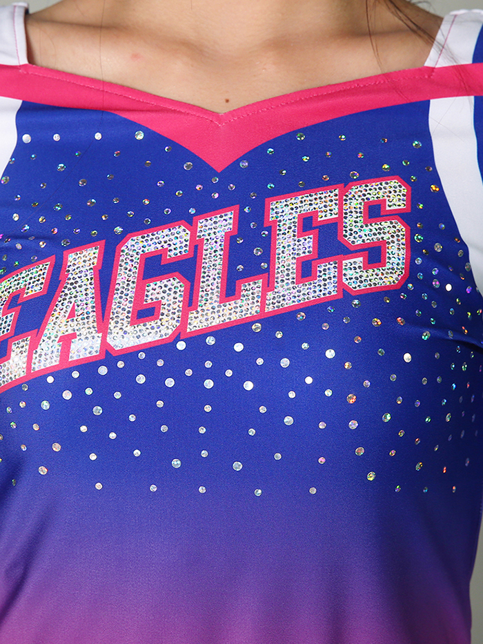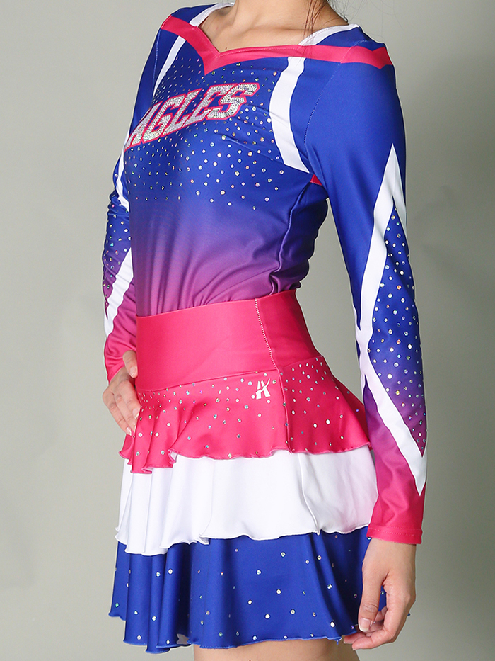 • Top: Long-sleeve fitted top with a V-neckline, featuring a smooth blue-to-pink gradient and bold “EAGLES” lettering across the chest. Crisp white shoulder detailing and crisscross back straps offer a striking silhouette, while scattered spangles across the chest and sleeves catch the light during movement.