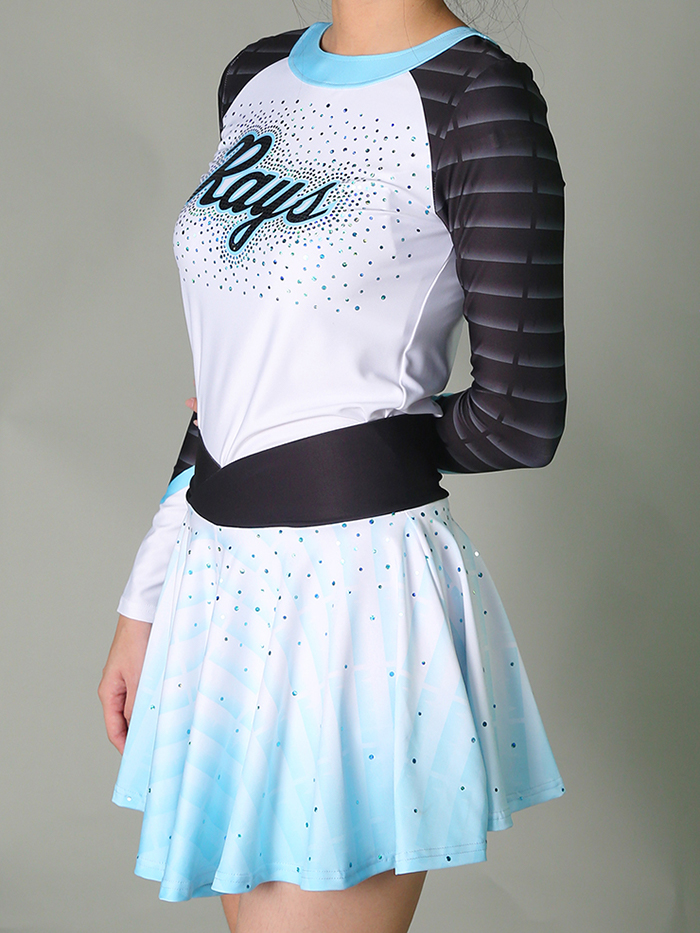 • Top: Long-sleeve design in white with quilted black sleeve panels and bright blue accents. The “Rays” script logo stands boldly across the chest, surrounded by scattered spangles for a sleek sparkle effect. A pop of blue at the neckline and open keyhole back adds flair and breathability.