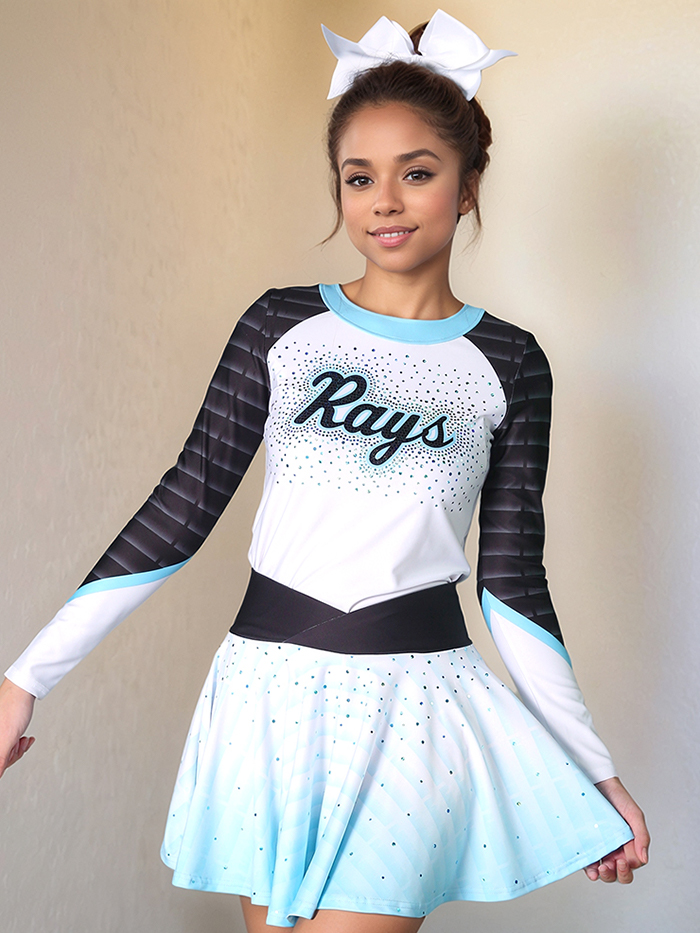 Top: Long-sleeve design in white with quilted black sleeve panels and bright blue accents. The “Rays” script logo stands boldly across the chest, surrounded by scattered spangles for a sleek sparkle effect. A pop of blue at the neckline and open keyhole back adds flair and breathability.
