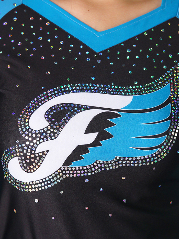 Top: Long-sleeve V-neck top in black with electric blue trim and angular diamond graphic sleeves. The chest features a winged “F” logo surrounded by scattered spangles for high-impact sparkle across the bodice and arms.