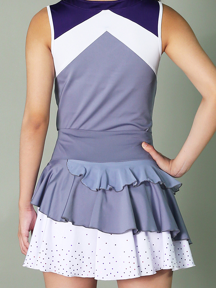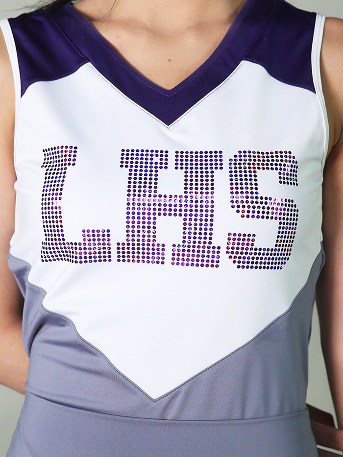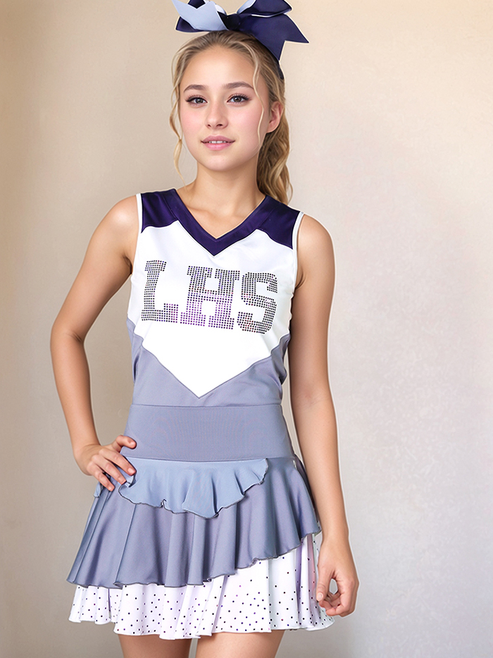 Bring charm and energy to the sidelines with the CSU070 Cheer Uniform – a sweet and sporty look with a modern twist. Featuring a sleeveless V-neck top, this design showcases bold “LHS” spangle lettering across the chest for extra sparkle under stadium lights. The layered ruffle skirt adds playful motion with a mix of solid and polka dot fabrics, creating a dynamic, spirited silhouette perfect for game day.