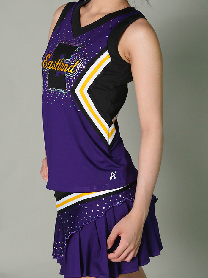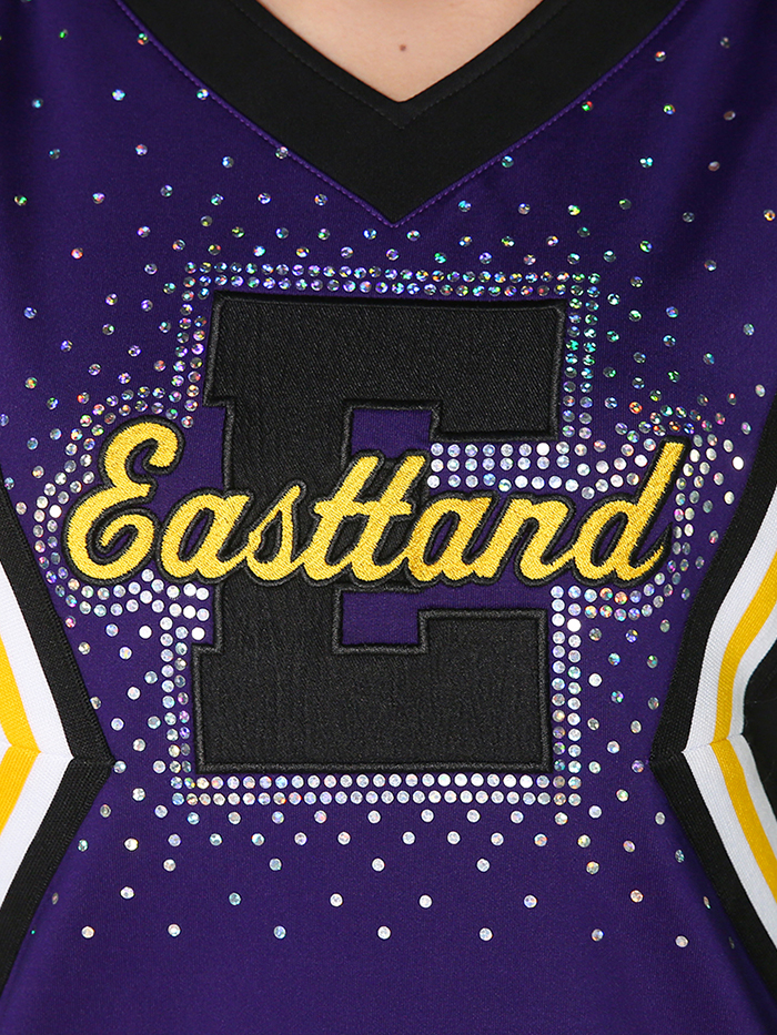Step up your sideline game with the CSU071 Cheer Uniform – a sleek, high-energy design in rich purple, black, and gold. The sleeveless V-neck top features bold color blocking and a sparkling spangle-accented “Eastland” logo front and center. Coordinated chevron stripes and rhinestone sparkle details add movement and shine, while the ruffled skirt brings a feminine, sporty finish. Ideal for pep rallies, games, and team performances.